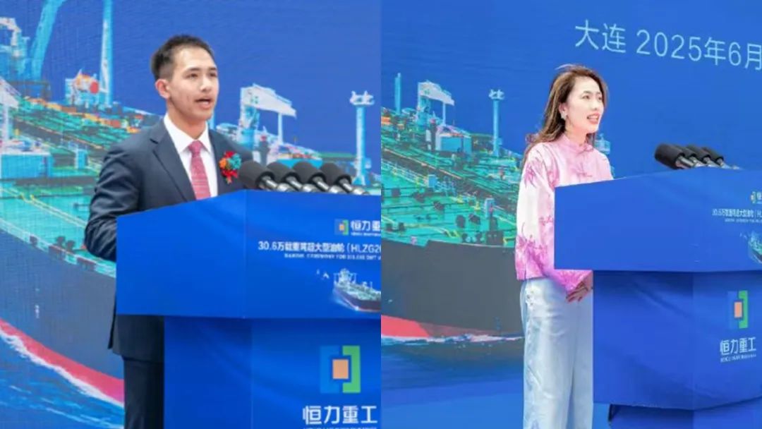 2025年6月24日,陈汉伦、陈逸婷在恒力重工制造的超大型油轮命名仪式上发言。图片来源:恒力集团